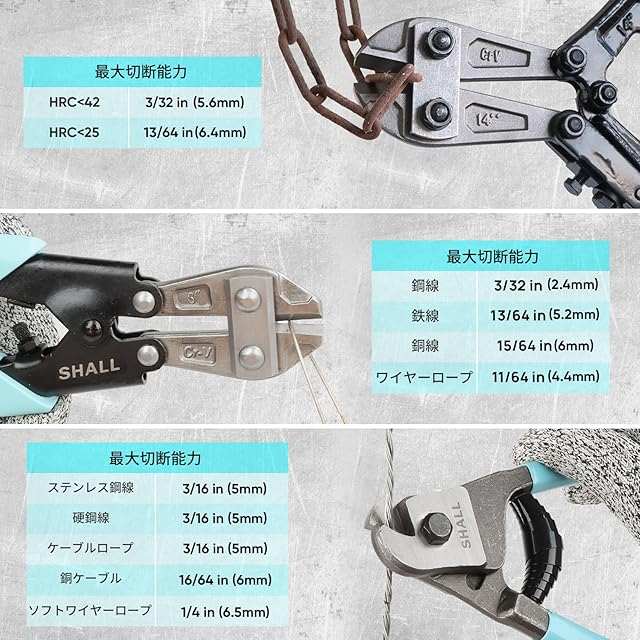 含まれるもの:14インチボルトカッター、マックスジョーの開口部は(15mm)で19/32です。 8インチのワイヤーカッター、最大顎の開口部は1/4インチ(7mm)です。 8インチワイヤーロープカッター、最大顎の開口部は7/16インチ(10mm)