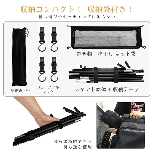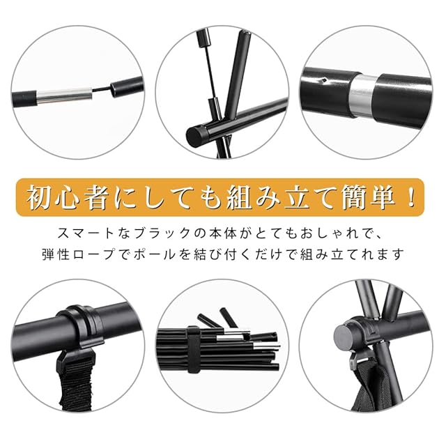 【組み立てEASY】高強度アルミニウム合金を採用し、メインポールの直径は1.9cm、サポートポールの直径は1.1cmで、高強度で耐久性を備えます。安定した三角構造でより良い安定性を提供し、耐荷重が8kgまで。ポールの接続部分に弾性ロープがで接続されて、ポールを結び付くだけで簡単に組み立てられます。一体型で紛失防止可能で片付けも何も考えずポールを外して折りたたむだけで分解簡単。