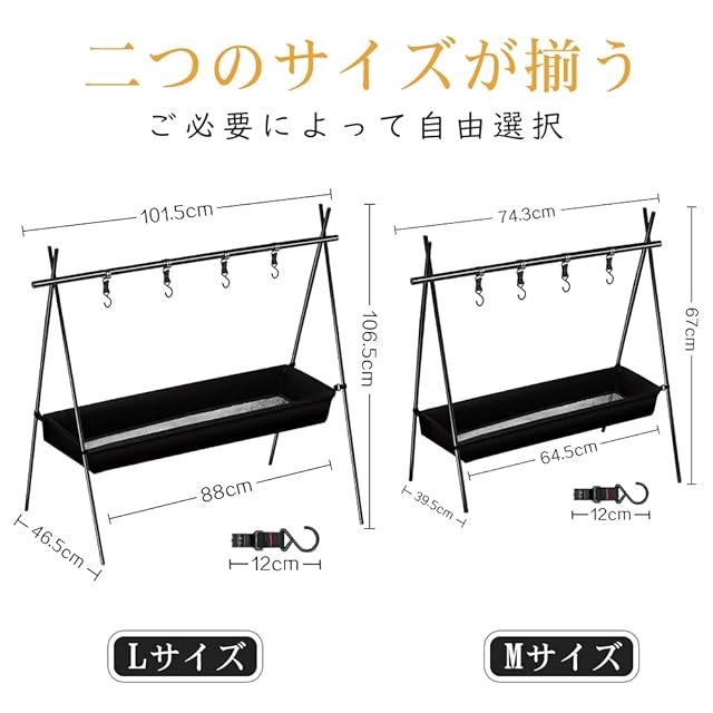 「高品質素材」 錆びにくく頑丈な高強度のアルミ合金素材を採用し、わずか746gで超軽量。メインポールの直径は1.9cm、サポートポールの直径は1.1cmで、高強度で耐久性を備えます。 「安定性上昇」 安定した三角構造でより良い安定性を提供し、耐荷重が8㎏まで耐えられます。3節の分割式のポールで組み立てます。また、ボール足にはプラスチック製のキャップがハマって、滑り止め可能で屋内で使用してもそれほど傷付けの心配は無いと思います。 「移動可能フック」 四つの移動可能フック付き、キャンプやバーベキューなどのアウトドア活動の時に、キャンプ用の食器、照明ランタン、バッグ、雑物などの整理だけでなく、乾いたいタオルなども掛けることができます。抜群な実用性があります。 「小物整理用システム」 収納用ハンガーと物干しネットが付属して、キャンプ用品も調理道具等の小物を収納できるメッシュポケットです。フックをポールに掛けると簡単に固定できます。 「組み立て簡単」 ポールの接続部分に弾性ロープがで接続されて、何も考えずポールを結び付くだけで簡単に組み立てられます。ねじ込み作業不要。片付けしたいときに単にポールを外して折りたたむだけで解体できます。 「収納袋付き」 専用の収納袋付き、簡単に折り畳んで、付属の袋にとてもコンパクトに収まります。わずか746gで超軽量、場所を取らず小さく持ち運べるので、どんな場所にでも持っていけるアイテムです。 「商品特徴」 材質:アルミ合金 展開サイズ:74.3×34×67cm 物干しネットサイズ:64.5×11×10cm メインポールの直径:1.9cm サポートポールの直径:1.3cm 梱包重量:約746g 本体耐荷重:8Kg 物干しネット耐荷重:4Kg ご注意: 1、小さい部品が誤飲、窒息などの危険があり、3歳以下の子供に適用されません。 2、鋭い部品がありますので、小さなお子様の手の届かないところに保管してください。 3、湿気を避けてドライ所に保管してください。 4、手作り測定のため、1-2cmの誤差になっているかもしれないので、ご了承ください。 5、光の関係で、画像にわずかな色収差の問題が生じる可能性があります。ご容赦ください。