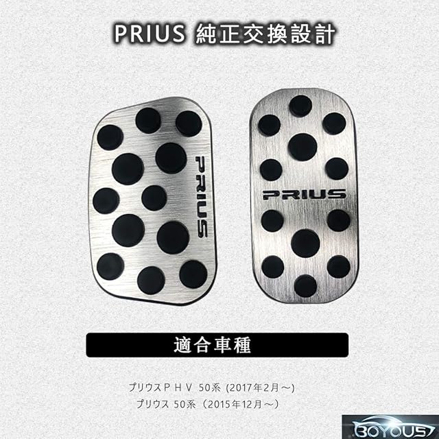 【商品説明】 トヨタ プリウス プリウスPHV 50系 前期/後期 用 アルミペダル<br> 本製品は純正カバーを外して付け替えるだけの簡単取付。<br> 穴開け作業は不要です。<br> ●純正部品と同じサイズで、アクセルペダルは、純正ペダルの上にそのまま被せます。<br><br> ●素材はアルミ素材を採用、グリッド部分にラバーソールを挟むことで、操作性もデザイン性も向上しています。<br><br> ●デザイン性だけでなく、ラバーソールで滑り止めを施し、確かな運転性を向上させています。 <br><br> ●ドアーをあけて、乗り込む時足元の雰囲気が最高です。<br><br> 仕様(スペック)<br> 材質: アルミ製 滑り止めゴム付き<br> カラー: ヘアライン仕上げ × ブラック<br> セット内容: アクセルペダル 、 ブレーキペダル<br><br> ■適合車種■<br> プリウス 50系 前期/後期 プリウスPHV 50系<br><br> 【セット内容】<br> ブレーキペダルカバー*1 <br> アクセルペダルカバー*1<br> 日本語説明書*1<br><br> 【取り付け方法】<br> ブレーキペダルカバー:ブレーキペダルは既存のペダルを外しはめ込んでいきます。タイトルに書いたように暖めてから着けると割とスムーズに作業出来ました。<br> アクセルペダルカバー:アクセルペダルは上からはめていくタイプ。<br>
