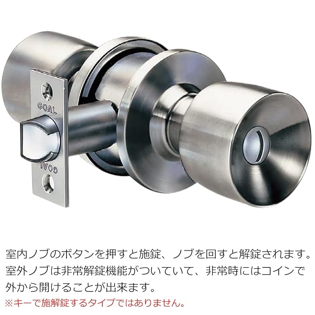 ロック機能付きで室内側からボタンを押すとロックされます。室外からもコインで開けられる非常解錠機能付きです。※キーの付属はありません