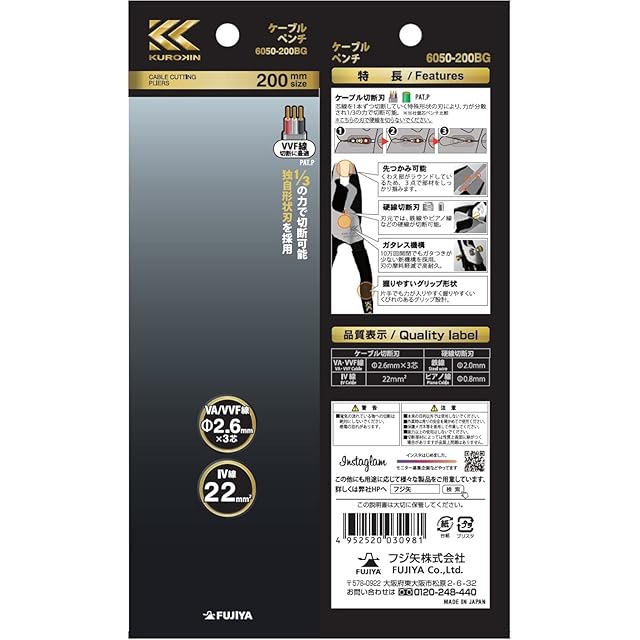 商品名:フジ矢 ケーブルペンチ 黒金 200mm 6050-200BG