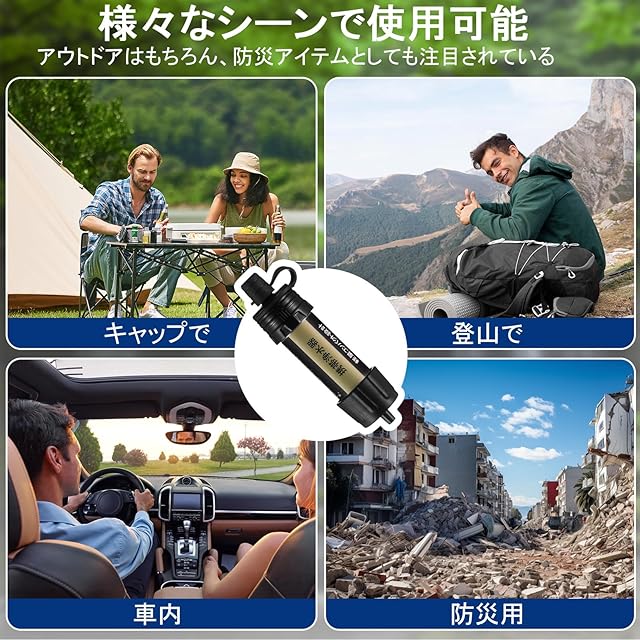 【防災アイテムとしても注目されている浄水器】地震や津波などの緊急時には、飲料水の確保が最も重要です。大規模災害の場合、道路が寸断されると上水道が復旧するまでに時間を要します。ライフラインが途絶えた時でも、ポータブルな浄水器を用いることで身の回りの水源からより安全な飲料水を確保することが可能です。※採水の際は、川であれば可能な限り上流の水を選ぶなど、なるべく綺麗な水を採ることで、フィルターへの負担が軽減できます。