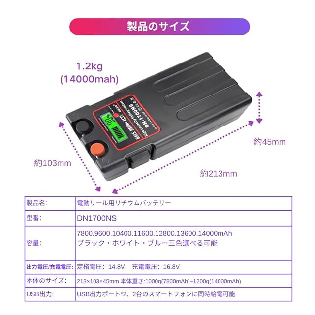 商品名:DNYO 電動リール用 大容量リチウムバッテリー 14.8V 7800mAh~14000mAh 選べる多仕様で!ダイワ シマノ 互換用DN-1700NS 電動リールバッテリー 充電器セット