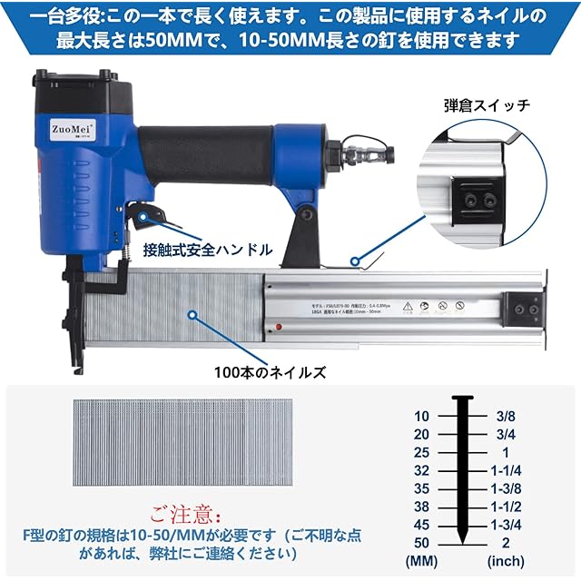 【商品特徴2】多規格な釘が使用可能、コスト節約:F型長さ10~50mmの釘はすべて使用でき、現在市場のネイル仕様の単一の問題を解決します。(ほかの釘打ち機は釘の最大使用可能な長さは20MM、25MM、35MMなど)いくつかの釘打ち機を買う必要がなく、お金を節約できます。