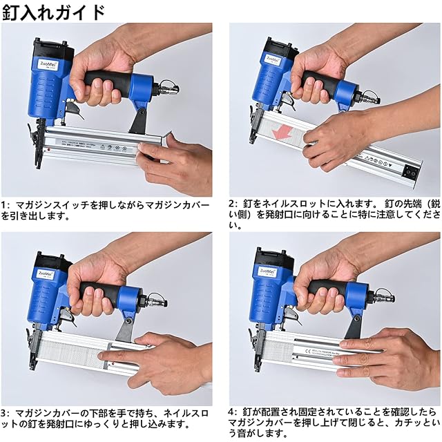 商品名:エアータッカー エアー釘打ち機 フィニッシュネイラー 1000枚釘付き 誤射防止 常圧 軽量 木工ツール 大工工具 日本語取扱説明書付き