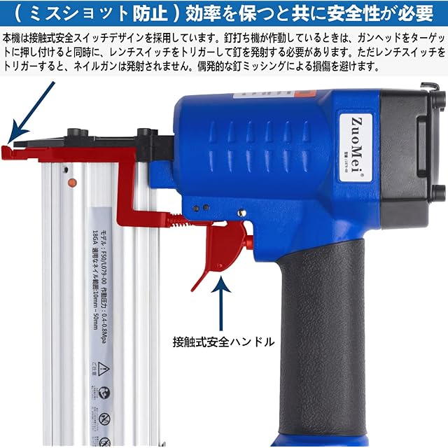 【ミッシング防止装置】釘打ち作業の安全を確保するため、本機は接触式安全スイッチデザインを採用しています。釘打ち機が作動しているときは、ガンヘッドをターゲットに押し付けると同時に、レンチスイッチをトリガーして釘を発射する必要があります。ただレンチスイッチをトリガーすると、ネイルガンは発射されません。偶発的な釘ミッシングによる損傷を避けます。