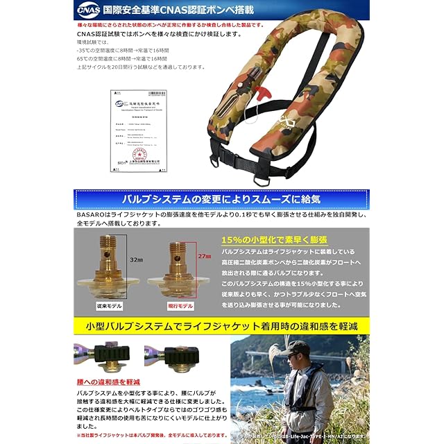 JES-BASARO (ジェスバサロ) ライフジャケット 手動膨張式 肩掛け ベストタイプ 救命胴衣 釣り メンズ レディース 浮力150N 日本国内メーカー B-Life-Jac-TYPE-J-MN/AT 日本語取り扱い説明書 国際安全基準CNAS認証品ボンベ搭載 (ブルー迷彩)