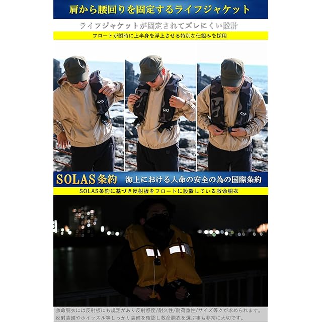 こちらのライフジャケットは国土交通省のライフジャケット設計基準に基づき設計を行っている製品になります。※国土交通省型式承認品ではございませんので、船舶法廷整備品には適合しておりません。また手動膨張式のライフジャケット ベルトタイプのライフジャケットよりも大きいフロートを搭載しておりマックスの浮力は150Nになっております。首掛け式ライフジャケットはフロートが人間の肺の位置でフロートが膨張する為、水中では安定した浮遊ができます。ライフジャケットの性能:最大浮力150N/24h 手動膨張装置 膨張用ボンベ33g レンジャーホイッスル搭載