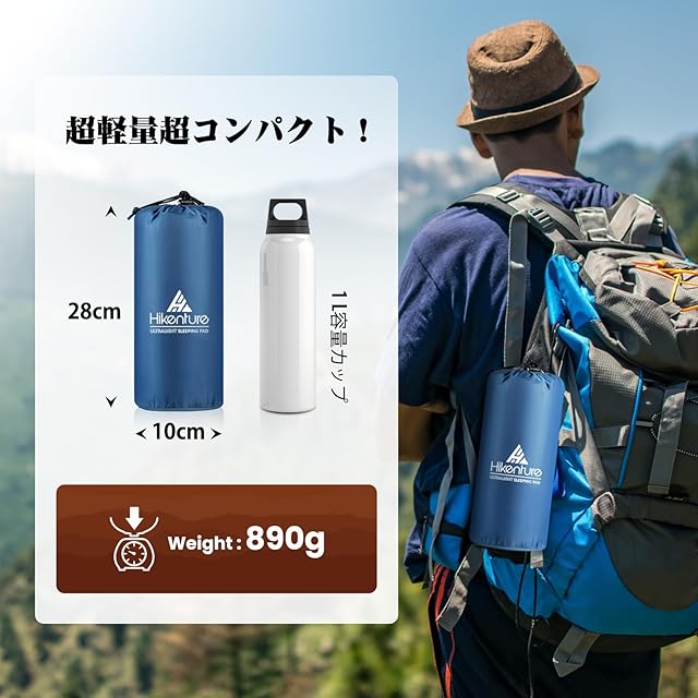 【超軽量コンパクト・迅速撤収】❶ テントマットの展開サイズ70cm*198cm、収納サイズ28cm*10cm、重さはわずか890g、ザックで持ち運べるうえ車やバイクでの保管はちょっとしたスペースに収納できます。❷ エアマット枕部の二重空気弁を開けて空気が一瞬に抜き、折り畳んで専用ゴムバンドで締めて、非常に便利です。空気の入れやすさも空気の抜きやすさもトップクラス、初心者や撤収作業の効率を求めるキャンパーにオススメです。