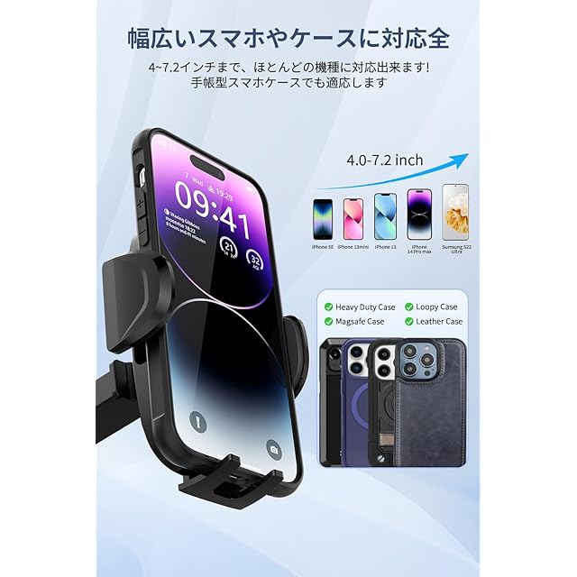 【片手操作&取付簡単】片手で簡単に着脱可能な車用 スマホホルダーです。両側のボタンを押すと、わずか0.1秒でスマホを挟むためのアームが自動に開きます。 スマホの背面でタッチボタンを押し込むことで固定アームが閉じ、しっかりと固定します。 ワンタッチ操作でスマホの脱着が可能で、急いでいる時も素早くスマホをスタンドから取り外し出来ます。 また、スマホ 固定のアームは専用設計したシリコン素材を採用、キズつきを防止しつつ、スマートフォンをしっかりと固定してくれます。
