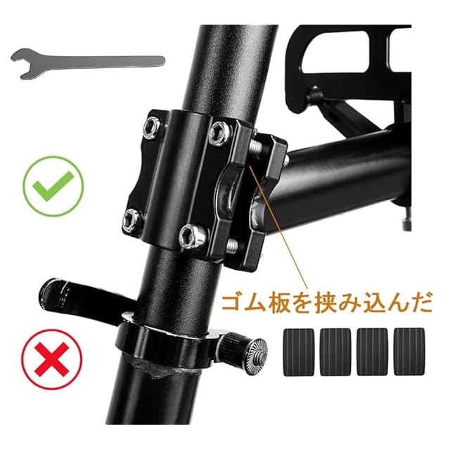 [シートポスト+支柱装着型]素材:軽量性、強度、耐食性に優れるアルミニウム合金製を採用します。8*ゴム製のスペーサー、2*取付け金具が付属します。