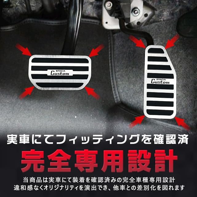 対応車種:<br> スズキ スペーシア カスタム MK54S MK94S<br> 車種別専用設計:<br> 車種別に専用設計されていますので、取付後の違和感も無く、取り付け後のガタや異音などもありません。<br> 上質な材質:<br> 高品質のアルミ合金と滑り止めゴムの組み合わせ,<br> ペダルは高品質アルミ合金素材で作られて、耐食性に強くサビにくく、キズがつきにくいのが最大の特徴です。ブラシをかけられた仕様、金属の質感が強い、操作性もデザイン性も向上しています。<br> 埋め込まれた立体的なゴムは雨の日でも滑らず安心して運転ができます。靴とペタルの摩擦も強くなります。安全性UP!<br> 製品の内容:<br> ①アクセルペダル×1<br> ②ブレーキペダル×1<br> 取り付け方法:<br> ブレーキペダルカバー:ブレーキペダルは純正のペダルカバーを取り外し、本製品を被せる。<br> アクセルペダルカバー:純正ペダルの上からそのまま被せる。<br> 注意:<br> 購入前に車種を確認してください。<br>