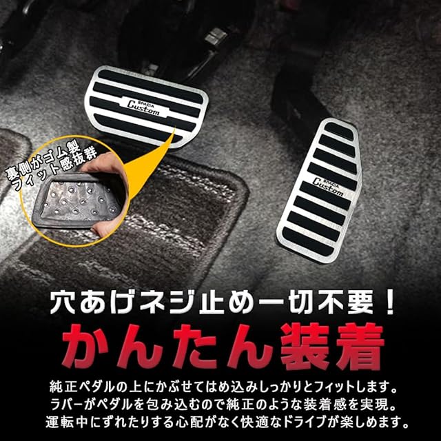 【取付簡単】:ペダルへの穴あけ等の加エや特別なエ具が必要無いポン付け仕様。始め方でもすぐに取り付け可能! 【取付方法】:1.アクセルペダルは純正ペダルの上から本製品を被せてください 2.ブレーキペダルは純正のゴムカバーを取り外してからお取付ください