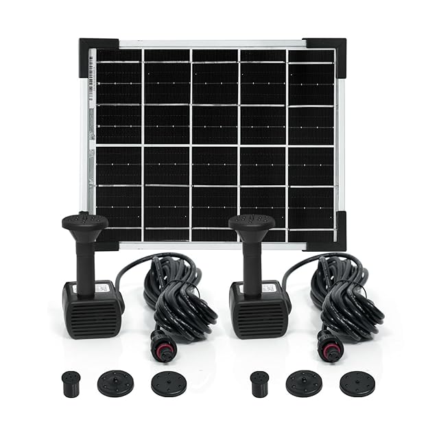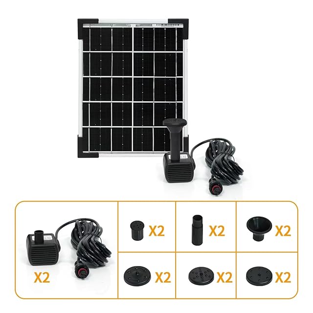 商品名:GWSOLAR ソーラーポンプ【2個付セット】ソーラー噴水 バードバス 5Wソーラーパネルでポンプ 2個同時駆動、ウォーターポンプ ガーデン用噴水 太陽光充電 酸素供給 水循環 ガーデン・お庭噴水用、ポンプ1つ使用の場合、曇り日に強い!! ソーラーパネル 接続ケーブル 3m / ブラシレスポンプ、最大流量 180L/H、最大揚程 0.9m、4種類噴水ノズル切り替え可能 型番:GW-FT500B