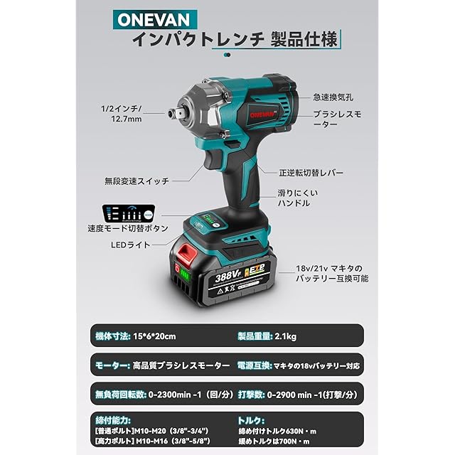 商品名:ONEVAN インパクトレンチ 18v 充電式 電動インパクトレンチ 18vマキタ 互換可能 緩めトルク700N・m 締め付けトルク630N・m 正逆転両用 4速切り替え LEDライト付き 無段変速 18vインパクト 電動インパクト 電動レンチ タイヤ交換 (青い, 700NM本体+ケース)