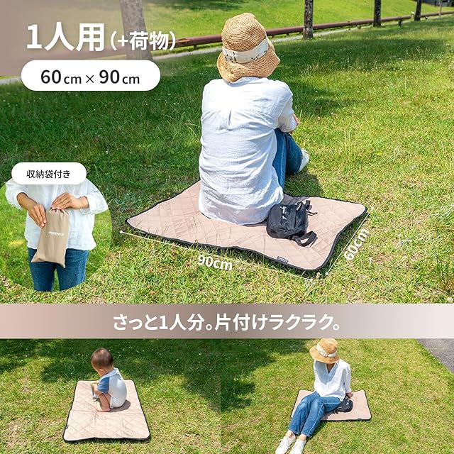 【おすすめ用途】お子様の遠足、ピクニック、花見、花火大会、運動会等のイベント行事、キャンプの際にテント入り口のマットとしてお使い頂けます。「1人+荷物」がちょうどいい大きさです。また、椅子のクッションにしたり、外出先でのおむつ交換シートとしても使えます。