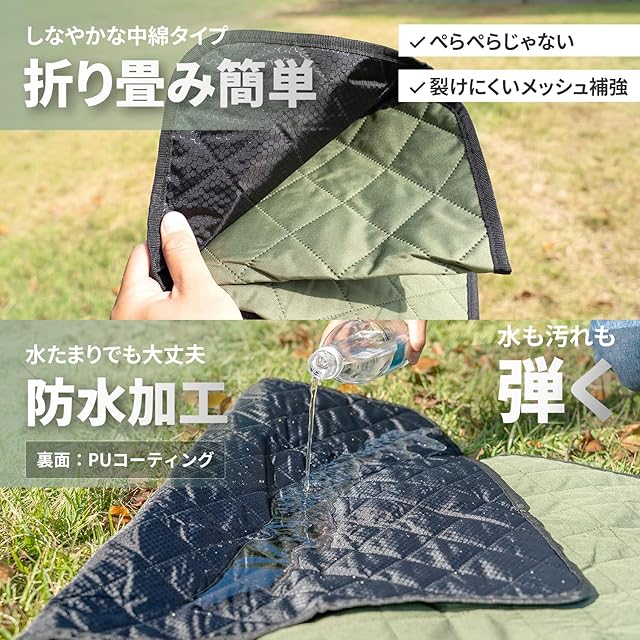 【素材】表面:シャリシャリの心地良い肌触りで通気性が良く、汗をかいた素肌で触れても”ぬるっ”としません。/中綿:中綿を詰めていますので軽度のクッション性があります。スポンジに比べて畳みやすく、通気性も良いのが特徴です。/裏面:防水加工(PUコーティング)を施していますので水たまりの上に敷いても染みません。ピクニックや日帰りレジャーならこれ1枚でOKです。