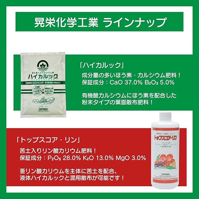 成分量:カルシウム(CaOとして)10.0%、水溶性ほう素1.3%。