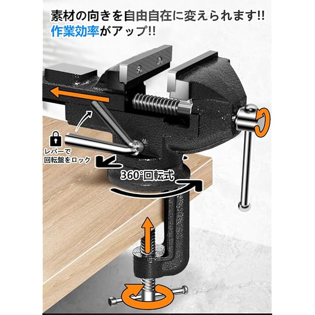 特徴:360度回転式ベンチバイス、回転台付きで、加工に便利、作業性がアップできます。取り付けや外しも自由で、細かい作業に最適です!
