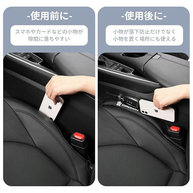 【小物の落下防止対策】 このカーシート隙間クッションセットは座席とセンターコンソールの隙間を埋めて、スマートフォンや財布、鍵などの落下を防ぐので 、小物が落ちたときの煩わしさから解放されます。 さらに、隙間を埋めるだけでなく、 スマホや車鍵など小物の置き場としても安心です。