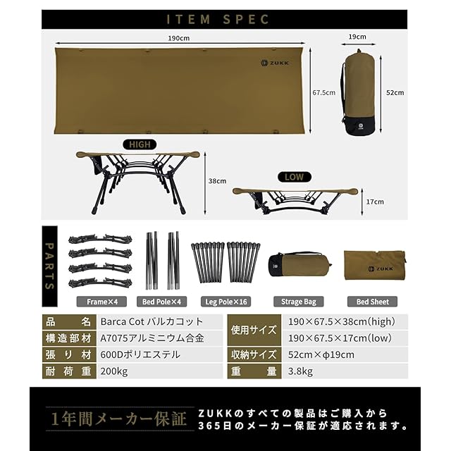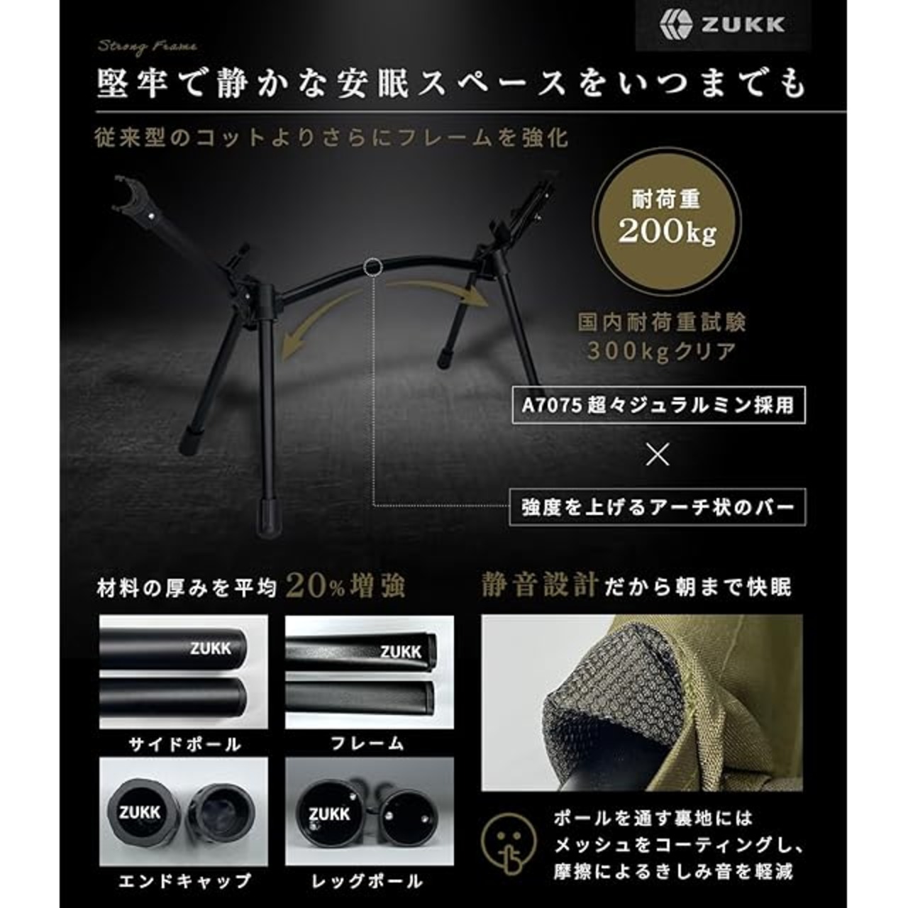 商品名:ZUKK 2WAY コット 耐荷重200kg キャンプ ベッド 高耐久 折りたたみ ハイ/ロー切替可能 (Beige)