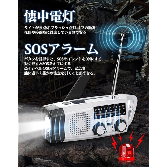 SARELLIT 防災ラジオ 手回しラジオ AM/FM/SW 多機能 手回し充電 ソーラー充電 TYPE-C充電 懐中電灯 SOSアラーム 小型 2000mAhバッテリー 取り外し可能 軽量 地震 台風 津波 停電対策 防災グッズ 日本語取扱説明書付き (ホワイト)