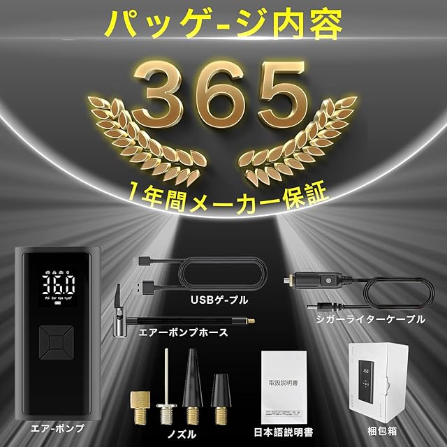 【大容量6000mAh & 急速充填で外出先も安心】 1回のフル充電で自転車24回分・自動車12回分の空気充填が可能。USB/シガーソケットの2WAY充電に対応し、車内や屋外での緊急時も即稼働。ブラシレスモーター搭載で60秒でバイクタイヤの0→35PSI充填完了。 【プロ仕様150PSI & 完全自動化設計】 最大150PSIの高圧対応でロードバイクからSUVまで幅広く適用。設定圧力到達時に「ビープ音+自動停止」が作動。過膨張防止機能と90秒自動電源オフで、初心者でも安全に操作可能。 【4種ノズル&仏米式バルブ完全制覇】 付属の4種類耐衝撃ノズルで、自転車(仏式)、車(米式)、ボール、浮き輪に瞬時対応。ワンタッチ接続で工具不要、手袋着用時でも確実に装着可能。※英式バルブ非対応 【マルチLCD表示&暗闇でも確実作業】 大型デジタル画面でPSI/BAR/KPA/kg/cm²の4単位を即時切替。残量バッテリー表示付きで計画的な使用が可能。3モードLEDライト(常灯/SOS/ストロボ)が夜間のタイヤ交換や緊急時をサポート。 【12ヶ月間の】 12ヶ月間の:弊社は製品の初期不良、自然故障、通常使用における不具合には12ヶ月間のが対応しています。本製品の使用過程に、何か不明なところがあれば、いつでも連絡してください。