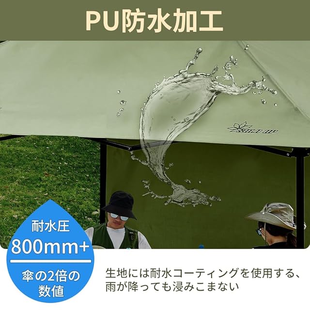 【生地仕様】ポリエステルオックスで作られた天幕の耐水圧は800mm以上あるだけでなく、縫い目からの雨漏れを防ぐシーム加工が施されています。日よけ効果の高いUPF・UV加工に加え、遮光性・遮熱性に優れた内側PUコーティングを採用した為、雨の日でも酷暑でも活用できます。※写真の光の加減や角度により実物の色が多少異なる場合があります。