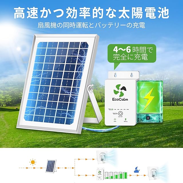 商品名:ecoCalm ソ一ラ一換気扇 10cm チ排気ファン,ソーラー 扇風機 両面太陽光パネル発電 & バッテリー付き充電,ソーラーファン 鶏小屋 ペットハウス 物置用 逆流防止バルブ付き