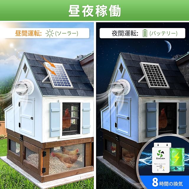 ecoCalm ソ一ラ一換気扇 10cm チ排気ファン,ソーラー 扇風機 両面太陽光パネル発電 & バッテリー付き充電,ソーラーファン 鶏小屋 ペットハウス 物置用 逆流防止バルブ付き