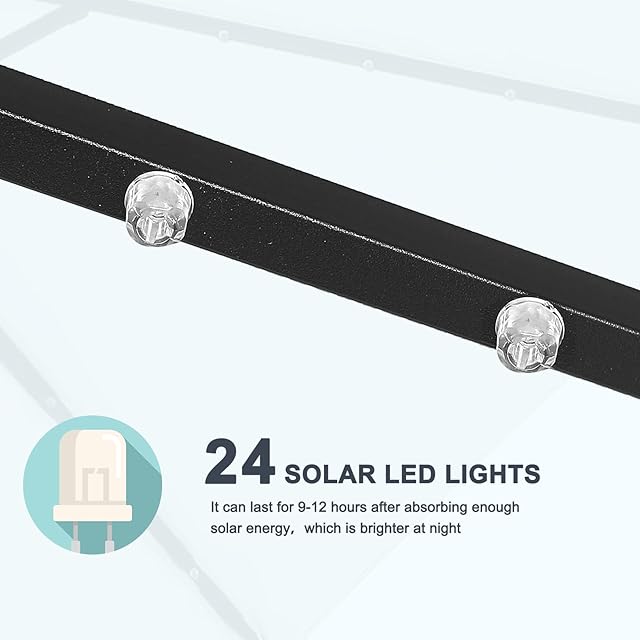 ✅使いやすい機能性:24個のソーラーライトを装備し、最大9~12時間の連続点灯が可能。スイッチ操作で簡単に照明のON/OFFを切り替えられます。上部の太陽光パネルが自動充電するため、面倒な配線や充電コードは不要。エコで経済的な設計です。さらに、ハンドルを回すだけで簡単に開閉できる回転式機構を採用。力の弱い方でも楽に操作できます。チルト機能付きで太陽の動きに合わせて最適な角度に調整可能。一日中快適な日陰をお楽しみいただけます。