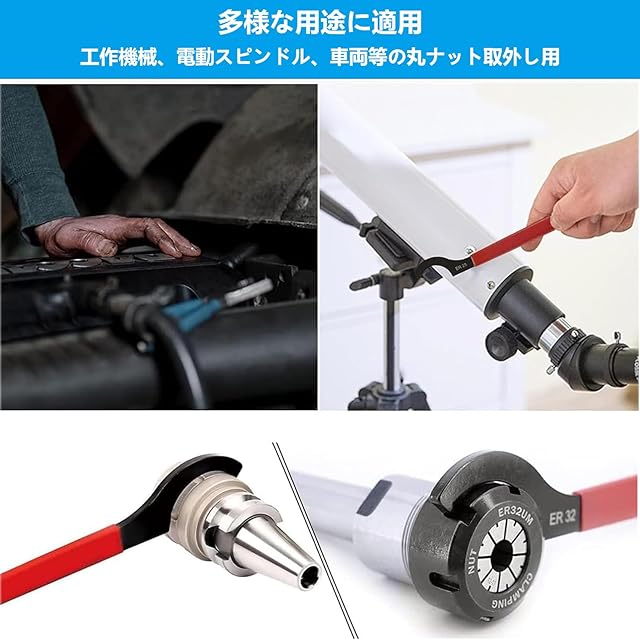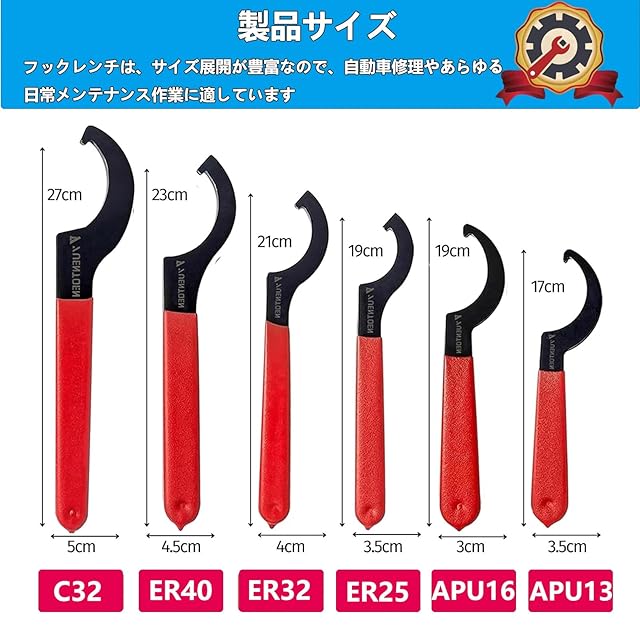 【製品サイズ】APU13、APU16、ER25、ER32、ER40、およびC32の6種類の異なるサイズのボディ高さ調整スパナは、車体の高さを調整する際にロックシートまたはスプリングシートを回転させるために使用されるツールで、さまざまなニーズに対応しています。