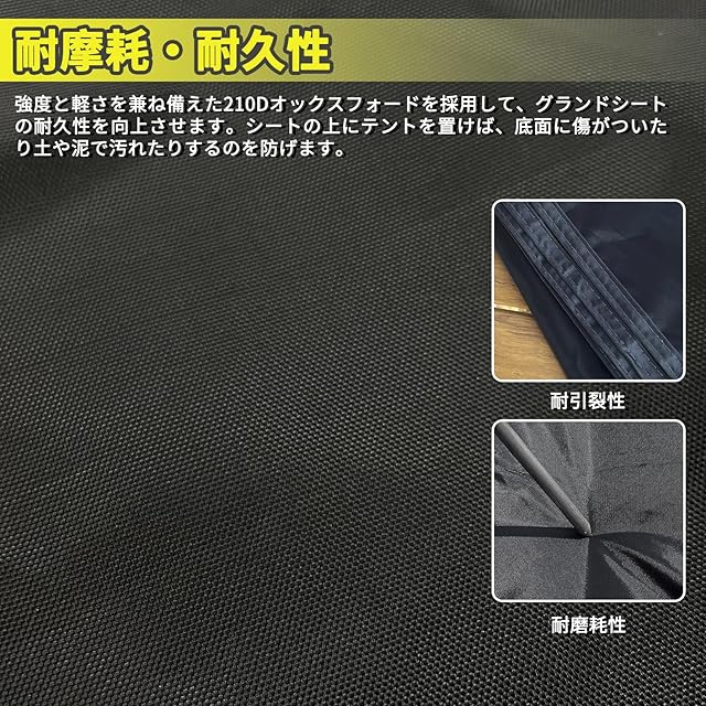 【耐摩耗性・耐久性】厚手の210Dオックスフォードを採用、耐摩耗性に優れて長時間で使用できます。テントの下に敷き、地面との摩擦や石による傷、汚れを防げます。