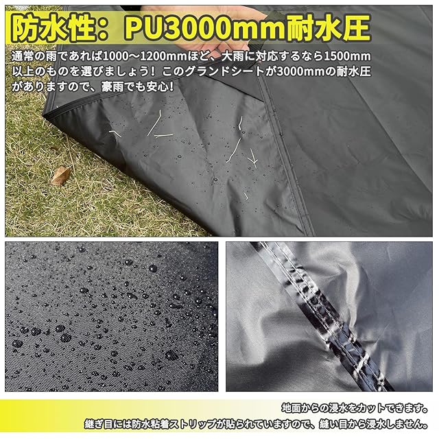 【PU3000mm・豪雨対策】縫い目はダブル裁縫で強化されます。シームテープで補強されて雨の浸水や湿気をしっかり遮断します。荷物置きやレジャーシート、防水タープの代わりとしても使えます。