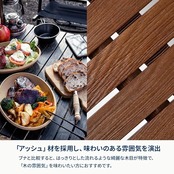 【日常でもアウトドアでも】 日常・アウトドアを問わず使いやすいデザイン。自然あふれるキャンプサイトは勿論、様々なシーンに溶け込みます。独特な木の風合いは、思わず写真を撮りたくなるような華やかな空間を演出します。
