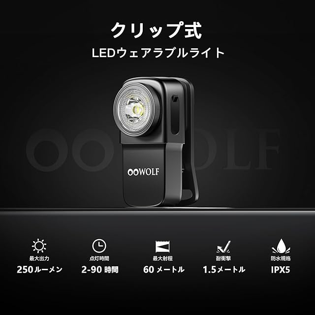 商品名:OOWOLF LED 懐中電灯 ミニ クリップオンライト 小型 Type-C充電式 ウェアラブルライト 白光&赤光 キャップライト 磁気 夜釣り 点検 犬 散歩 キャンプ サイクリング ハイキング アウトドア ハンディライト 登山 防災 停電対策 ブラック