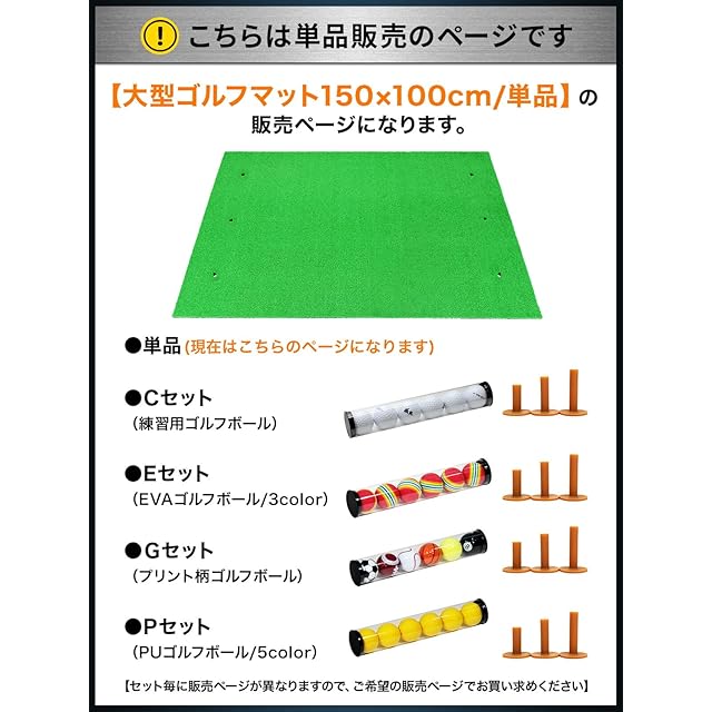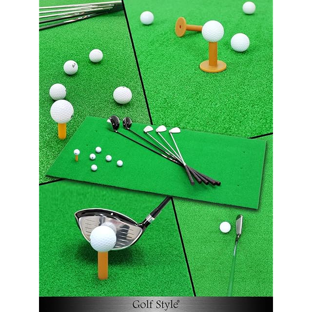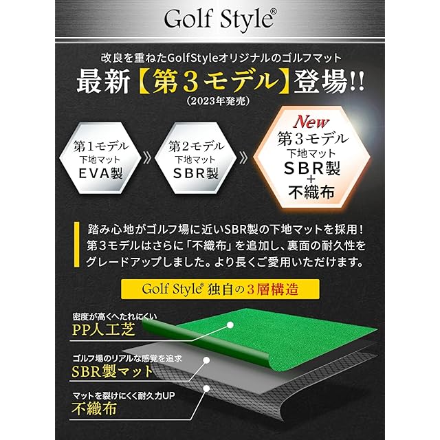 GolfStyle独自の3層構造マットを開発しました。特許申請中の技術となっており、当店独自のゴルフマットとなっております。GolfStyleはリアルな練習を自宅でもできるよう様々なゴルフマットを研究開発しております。こちらのSBRゴルフマットは超大型サイズだから大人の男性でも余裕でスタンス&ショットが可能です。マットの上に立って打てるので本番に近い環境で思いっきり打てます。表面の人工芝は叩いてもへたれにくい、長く使えるポリプロピレン人工芝を使用、裏面は柔軟性があり、踏んだ時のリアルな芝感を実現したSBR製マットなので、グリーン上に似た感覚でショット練習ができます。お客様のご要望に応え、あらゆるスタンスに対応できるように6カ所にティー用の穴を開けました。左右に開いているのでレフティーの方でも対応しています。また、マットがへたってきても入れ替えて使用ができます。使わないときは丸めて箱にしまうことができます。マットの部分は商品改善を行い、巻き癖が残るEVA製マットから巻き癖がつきにくいSBR製マットに変更しました。丸めても元に戻るの安心してご利用いただけます。サイズは縦幅150cm×横幅100cm×厚さ18mm(人工芝10mm+土台SBRマット8mm)※写真参照、重量は4.5kg、マットカラーはグリーン、素材/材質はSBR、PP(ポリプロピレン)人工芝、各種ゴルフボールやゴムティーなどセット内容をお選びいただくことができます。
