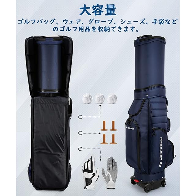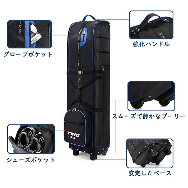【製品概要】<br> 素材:600Dナイロン生地+綿裏地<br> 重量:2.47kg<br> サイズ:26.5*27*131cm<br> 便利で折りたたみ式、牽引車輪付きでより省力化、大空間・大容量、クラブやゴルフバッグを簡単に配置でき、委託の問題を解決します。<br>