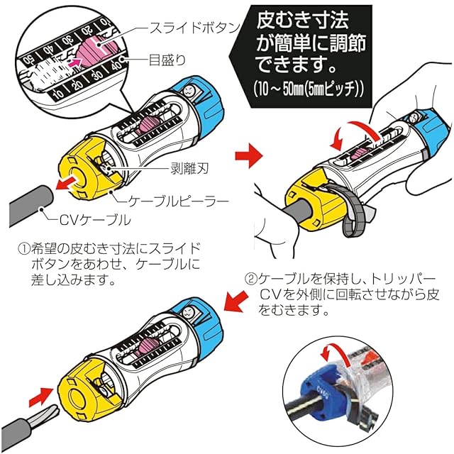 大人気のトリッパーCVに樹脂製ハードケースフルセットが出ました!<br> ケースサイズ:220mm×160mm×68mm<br> 簡単手回しで素早く皮むき!ちょっとした時短術。<br> ケーブルの被覆が簡単、キレイにむける コンパクトな皮むき器です。<br> 皮むき寸法10~50mm(5mmピッチ)が簡単に調節できます。