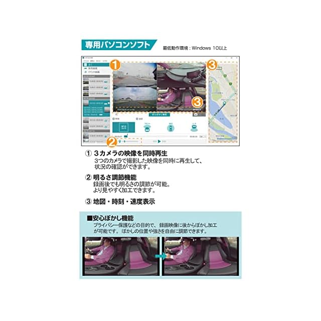 【専用パソコンソフトで録画映像をより詳細に確認】(最低動作環境:Windows 10以上)3カメラ同時再生可能!3つのカメラで撮影した映像を同時に再生して、状況の確認ができます。明るさ調整機能で録画後でも明るさの調整が可能。録画した映像をより見やすく加工できます。位置情報から算出した車両位置と、録画時刻・車速を表示可能。安心ぼかし機能付きでプライバシー保護などの目的で、録画映像に後からぼかし加工が可能です。ぼかしの位置や強さを自由に調整できます。