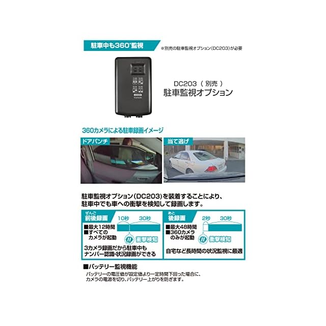 【駐車監視機能について 】別売の駐車監視オプション(品番:DC203)を装着することにより、駐車中でもドアパンチや当て逃げなどの車ヘの衝撃を検知して録画します。