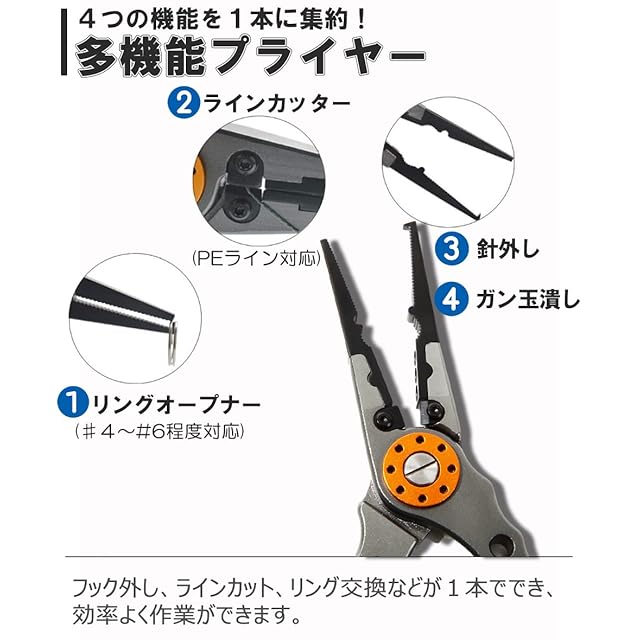 【フィッシングプライヤー】針外しに便利なロングノーズかつ頑強 /アルミ合金で軽量かつ錆に強く、作業に使う部分は丈夫なステンレス鋼 / スプリッドリング交換は#4〜#6程度に対応