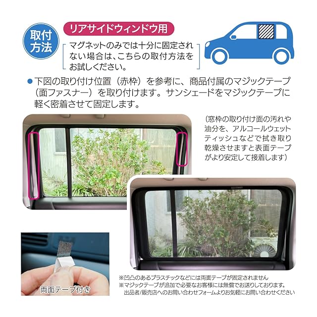 <ご利用方法>車内側から窓枠にマグネットで固定してください。車体の金属パーツにサンシェード内蔵のマグネットが吸着します。 より強く固定されたい場合は、商品付属の両面テープ付きマジックテープをご利用ください。窓枠周囲の任意の場所に貼り付けていただくと、サンシェード周囲の素材にマジックテープで接着します(脱着可能)。貼り付け前にはウェットシートなどで貼り付け予定の場所を拭いて乾燥させていただくと両面テープが剥がれにくくなります。凹凸のある面には両面テープが付きにくくなっております。不足する場合は無償でご送付しますのでお問い合わせフォームより出品者までお気軽にご連絡ください。 <ご注意> ※窓枠とシェードの間には若干の隙間が生じます ※窓を大きく開けると脱落の恐れがあります ※走行時や強風時には窓を閉めてご利用ください ※折り畳んだ状態でお届けしますので、開封時にサンシェードが急に開く可能性がございますのでご注意ください ※自動車メーカー純正品ではありません ※製造ロットによりタグの表記が異なる場合がございます