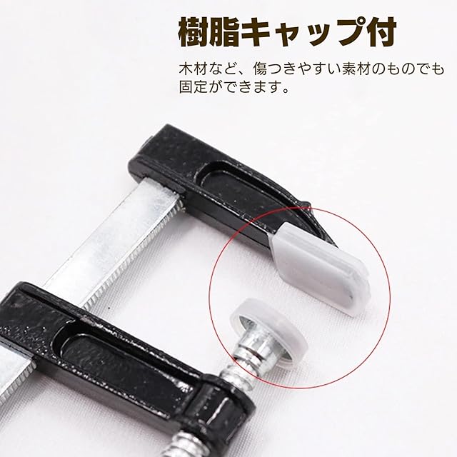 接着面には保護用の樹脂キャップが付属しており、木材など傷つきやすい素材の固定にも安心して使えます。高温素材を扱う場合は、キャップを取り外してご使用ください。錆に強いスチール製のf 型 クランプ(開口幅約300mm)は、しっかりとした固定力を発揮し、厚みのある部材の固定にも適しています。