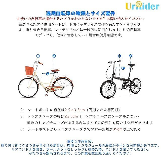 シンプルで簡単にインストール可能--UrRiderの子供用自転車シートは、わずか60秒で取り付け可能であり、30秒で取り外し可能です。ツールは必要ありません。都市用自転車、女性用自転車、折りたたみ自転車に対応しています(注:1. 自転車のシートポストの直径が3.5cm以下、自転車のチューブの幅が5.5cm以下のものに適しています。2. トップチューブにケーブルがある自転車には適していません。