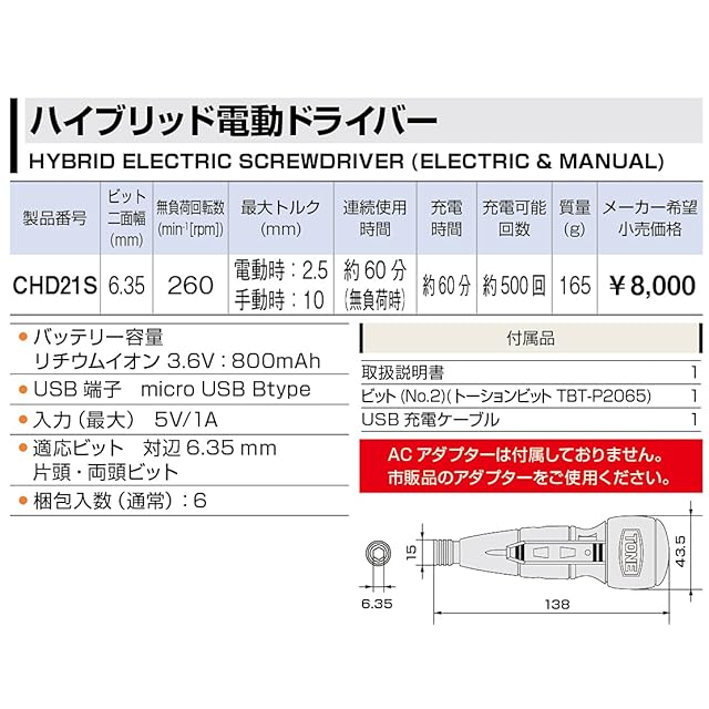 商品名:トネ(TONE) 電動ドライバー CHD21S ビット差込 ホワイト 2.5N・m