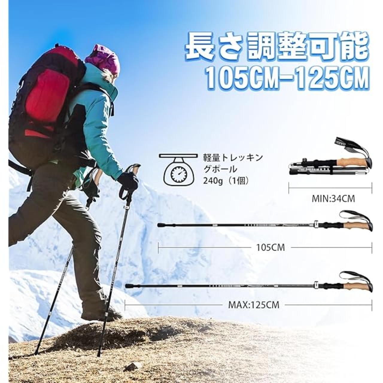 【トレッキングポールの仕様】本体素材:カーボンファイバー 使用サイズ:105~125cm(調整可能)トレッキングポール1本の重量:218g(キャップ含まない) 使いコツ:(1)ストラップはうえから下まで4本あります。最初は4本目を引っ張り、3本目(スナップ月)を引っ張りした後、自由に長さを調整することができます。(2)レバーロックを閉じた状態でナットが調整できません。レバーロックを外して、ナットを調整します。身長に応じて二段目の長さを調整して、緩むかを確認します。もし緩む感じる場合、ナットをもっと固く締めます。レバーロックを閉じます。