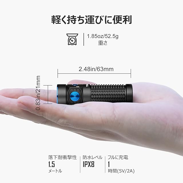 仕様: l 【主な素材】:航空機級アルミ合金製 l 【明るさ】:1300ルーメン l 【 輝度(約)】:7225-21カンデラ l 【サイズ】:長さ:63MM、ヘッド直径:21MM、ボディー直径:21MM l 【重さ】:52.5g(電池含む) l 【働き温度】:0-40℃ l 【働き電圧】: 2.8-4.2V l 【電池】:OLIGHT専用充電電池 l 【防水レベル】:IPX8 l 【耐衝撃性】:1.5m落下耐久 l 【充電】:充電ケース/MCC1A/MCC3