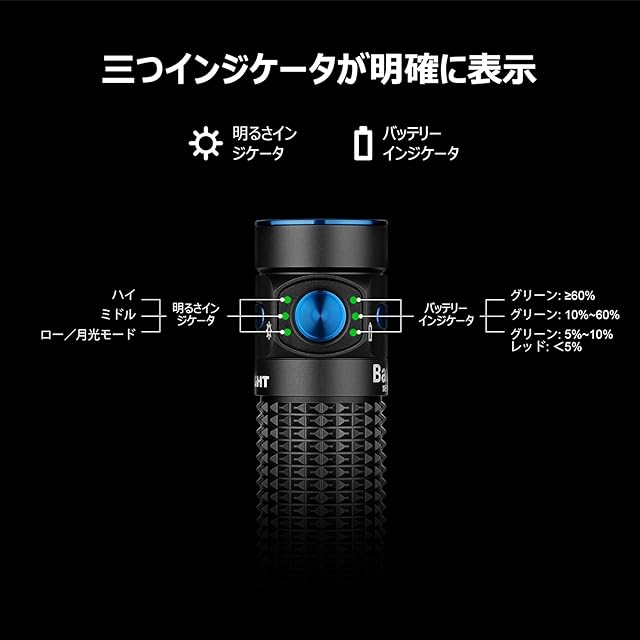 {明るさとバッテリー残量の表示+高耐久性} お客様の利便性をさらに高めるため、小型懐中電灯Baton4は新しい技術を使用して、金属ボタン上にパネルを作成し、明るさと電力の残量を簡潔に表示することができます。フル充電すると、月光モードで最大30日連続使用可能です。点灯モードによって持続時間は異なります。緊急時や停電時の対応、日常生活で幅広く活用することができます。また、保護板を内蔵し、新型バッテリーを採用し、Baton 3に比べて安全保護レベルが高くなり、バッテリの容量も18%アップしています。予備電源としての充電ケースとの併用で、暗闇の中で突然懐中電灯の電力が切れてしまう心配がなく、安心感が高まっていきます